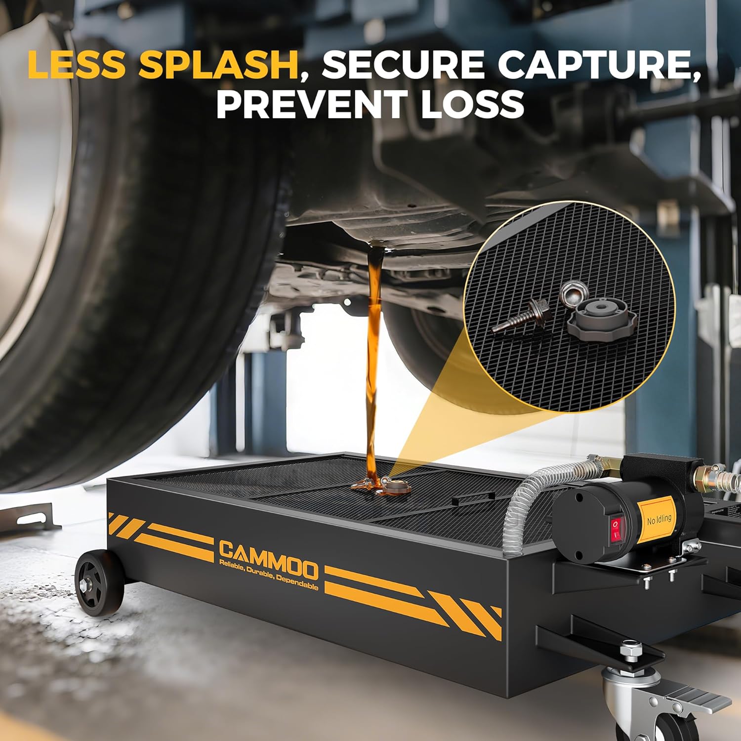 - User-Friendly Design:The 28.9× 16.9" filter screen with smaller holes on oil drain pans minimizes splatters and catches dropped parts, keeping floors clean and saving time. Its 1.2 mm metal frame resists warping, ensuring durability for oil drain pans. The T-handle folds from 40–180°, collapses flat for storage, and reaches easily under vehicles—perfect for maneuvering oil drain pans. Two fixed 4-inch wheels and two 3-inch swivel wheels with brakes ensure stable, secure positioning for oil drain pans—even on slopes. Together, these elements make every oil change with oil drain pans quicker, neater, and hassle-free.
