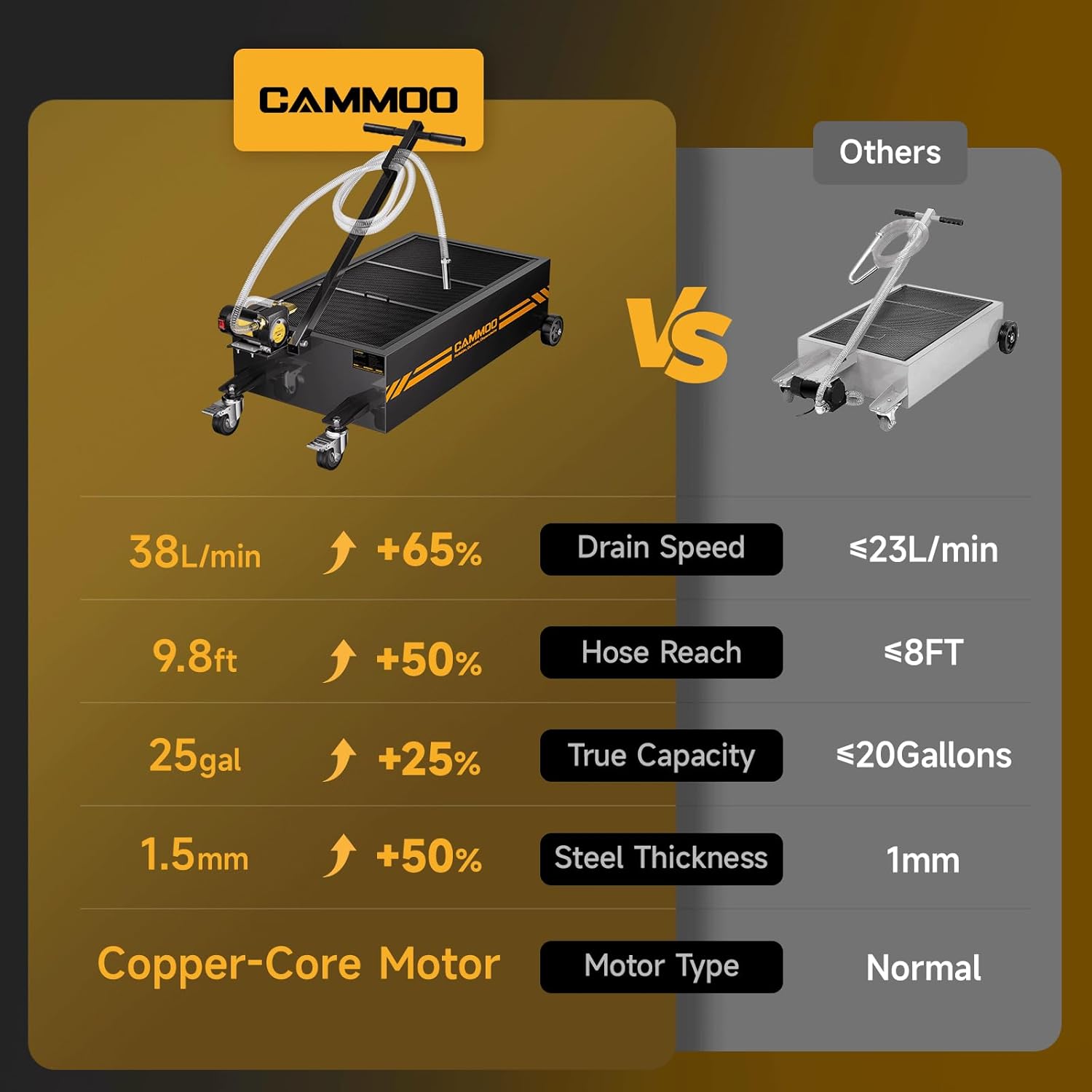 - High Capacity:Oversized 39.76" x 23.23" x 8.5" steel tank delivers a verified 25 gallons and provides a bigger footprint than standard oil drain pans so shop owners, fleet managers, farmers and DIYers can drain a full-size pickup, two RVs or four sedans in one go with less lifting, fewer trips to the recycler and more time for paid jobs. It works with all common waste oils (motor, hydraulic, etc.)—gasoline explicitly excluded.