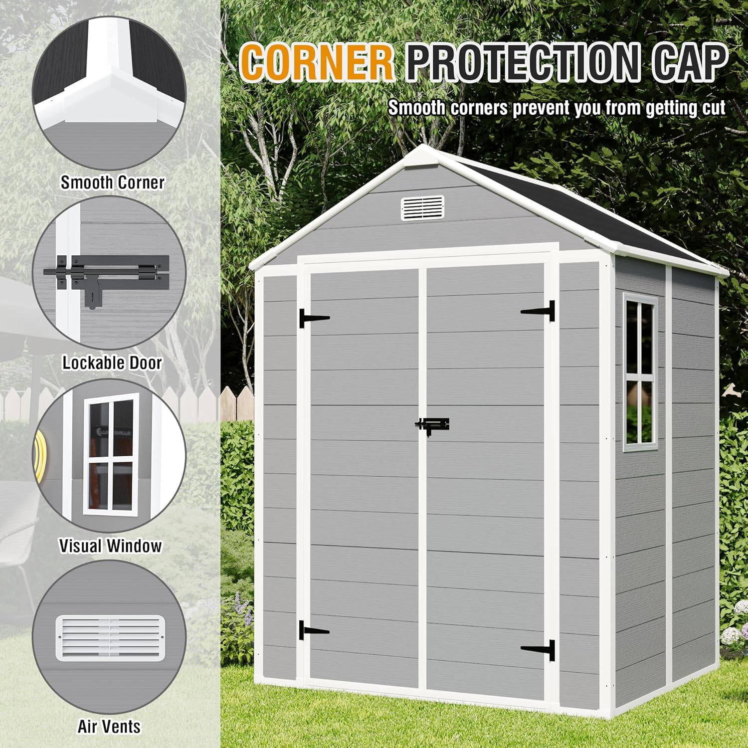 - đ ăIntegrated Vents & Clear WindowăDesigned for airflow and visibility, this garden shed features louvered vents above the door to enhance ventilation and reduce moisture buildup. A crystal-clear side window fills the interior with natural light, eliminating dark corners and making it easier to find your tools and supplies