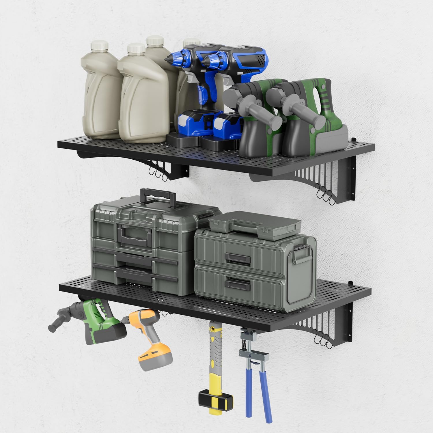 YOLENY 2-Pack 2x3FT Adjustable Heavy Duty Garage Wall Shelving, 500lbs Load Capacity Wall Mount Storage Shelf, Garage Storage Rack with Hooks, Metal Floating Shelves Organizer for Workshop