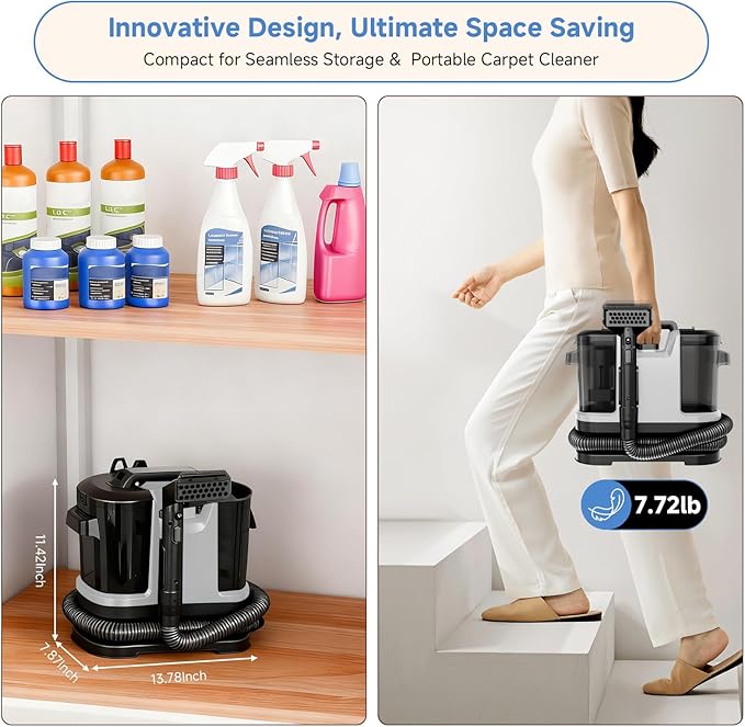 - Portable & Easy to Store: This portable carpet cleaner machine and small carpet cleaner machine comes with an ultra-long hose (5ft) and power cord (16.4ft). Lightweight and easy to move around, it can clean multiple surfaces throughout your home. The brush and power cord can be stored on the machine's hook to save space. It serves as an excellent spot cleaner for carpet and upholstery and spot cleaner machine, making it a versatile tool for your cleaning needs