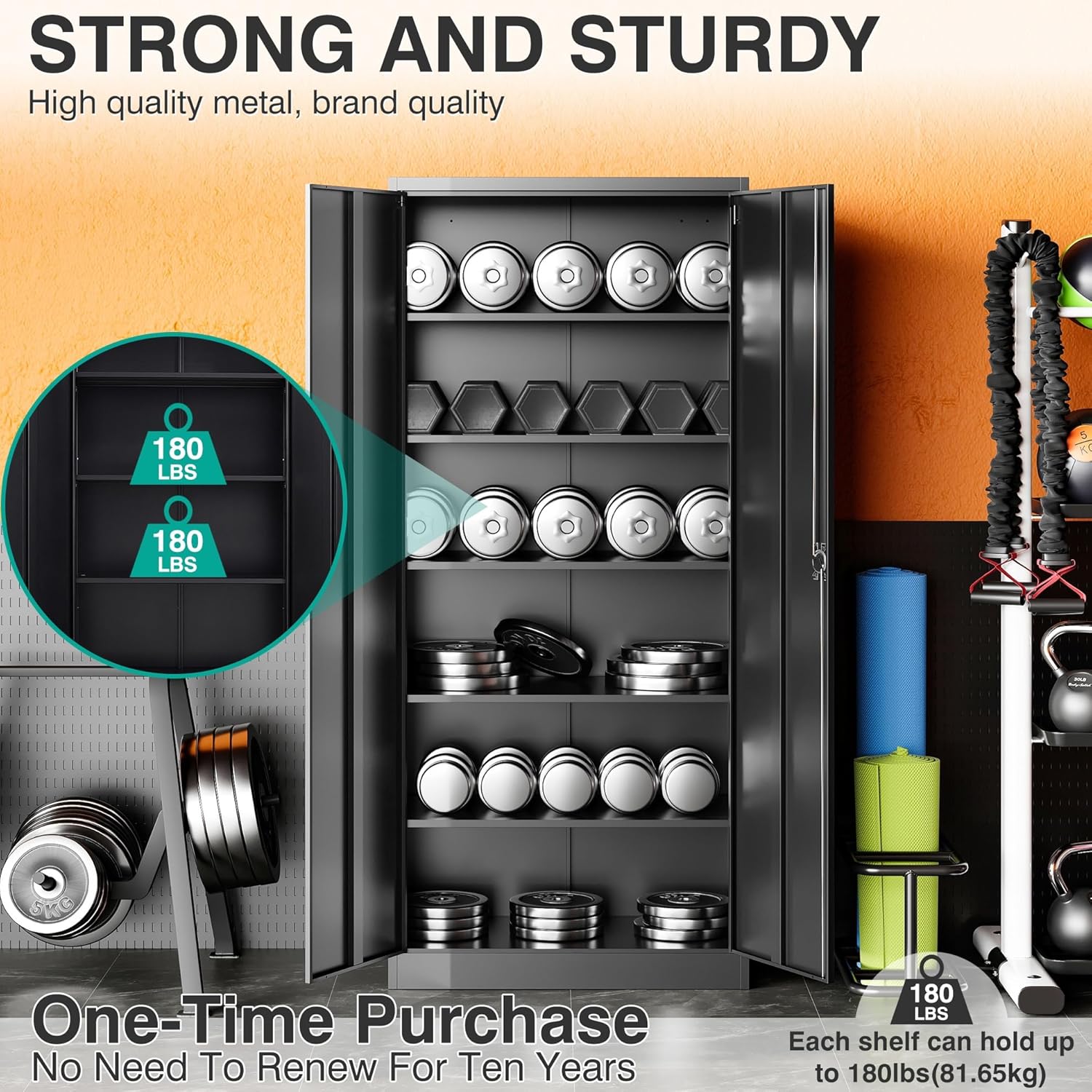 - Bigger Size and 6 Tier Space: Large storage cabinet overall size: 72 inch×36 inch×18 inches (H x W x D). This metal storage cabinet has a strong and durable metal frame with excellent load-bearing capacity, allowing you to store enough items. Weight Capacity: 900 lbs total, the lockable storage cabinet has 5 adjustable shelves, each shelf holds: 180 lbs