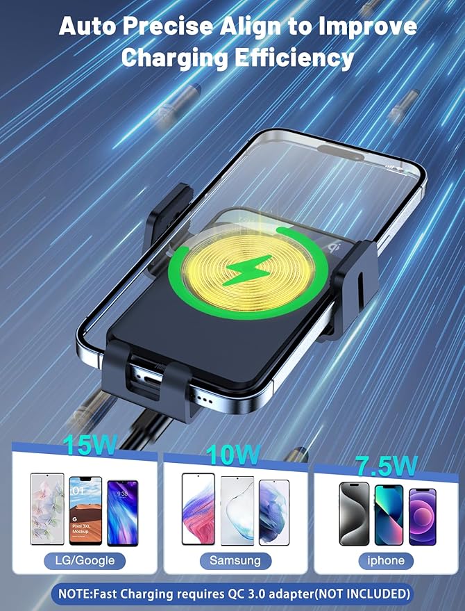 - 【Wireless Car Charger】15W Wireless Fast Charging for LG V50/V40/V30/G8/G7; 10W for Samsung Galaxy S23 Ultra/S23+/S23/S22 Ultra/S22/S21/S20/Note 20/Note 10+/Note 10; 7.5W for iPhone 15/14/14 plus/14 pro/14 pro max/13/13 Pro/12 Pro Max/12 Pro/12/11 /11 Pro /11 Pro Max /SE /XS /X/XR/8 Plus/8; Note: 15W/10W/7.5W Fast Charging requires QC 3.0 car charger (NOT INCLUDED), 5W standard wireless charging for other wireless charging Phones (5V/2A adapter is required).