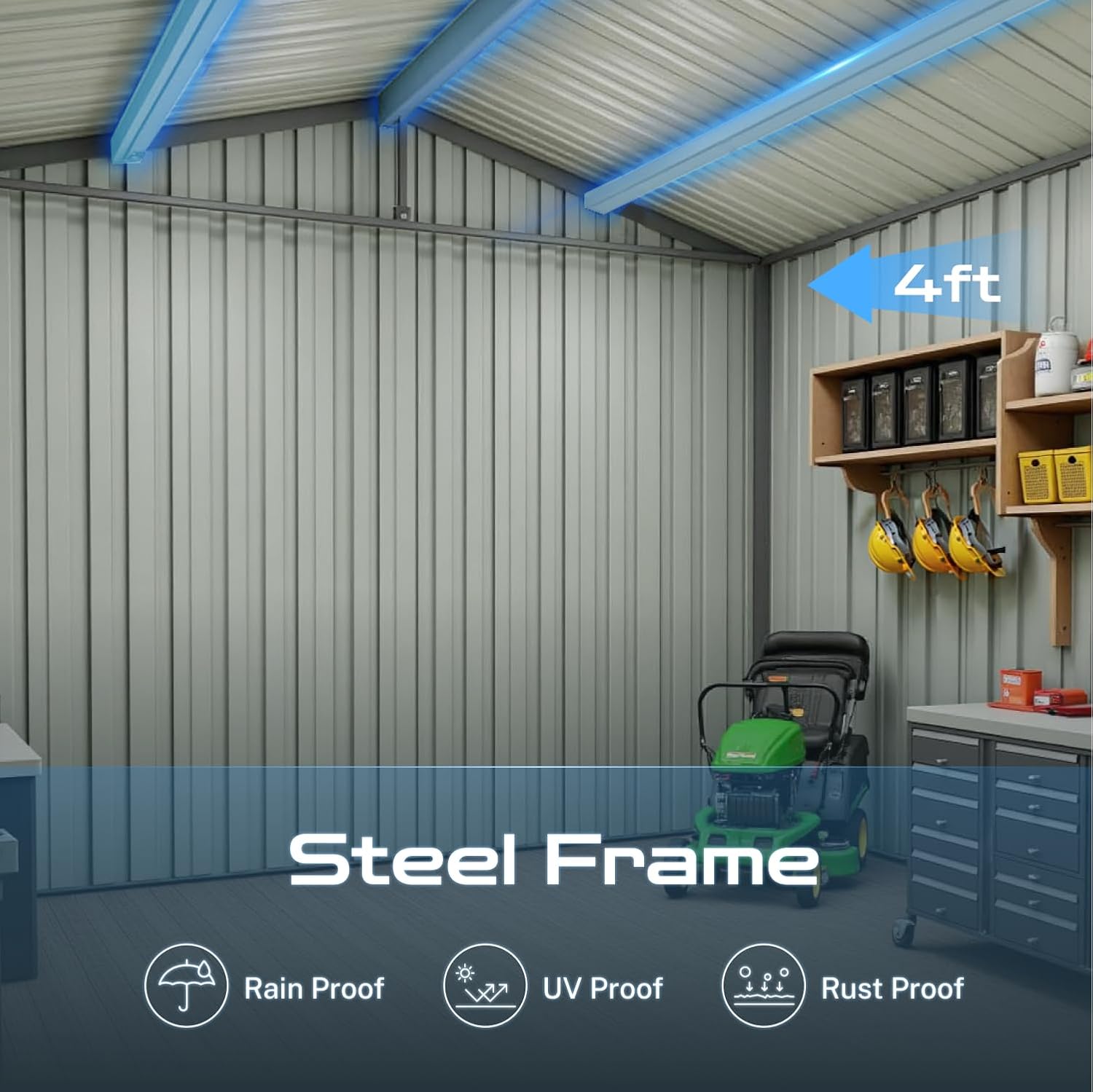 - ā [Sloped Roof for Superior Weather Protection] Designed for real-world conditions, the efficient sloped roof system guarantees optimal rainwater drainage, preventing damaging pooling and leaks. This key feature in our storage buildings and sheds clearance design minimizes maintenance and ensures your tools, equipment, and belongings stay consistently dry inside