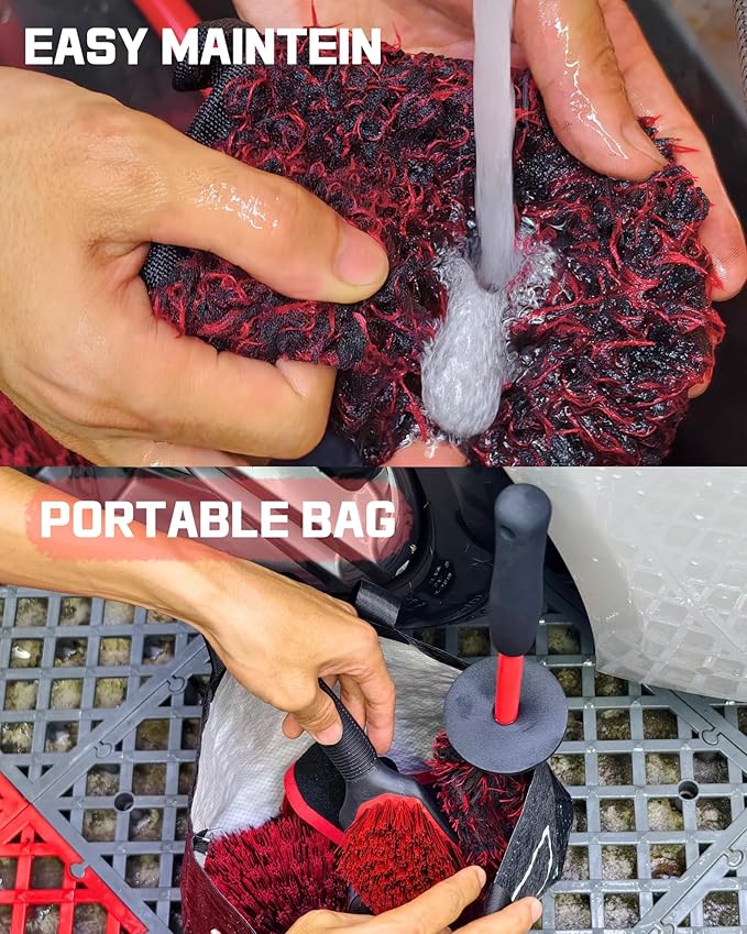 - 【UPGRADED 8-PCS PROFESSIONAL WHEEL CARE KIT】Your complete solution for pristine wheels. This comprehensive set includes the NEW Microfiber Wheel Brush (for barrels), a Stiff Pro-Grip Tire Brush (for sidewalls), a Heavy Duty Tire Brush (for wheel face scrubbing), a Horsehair Detailing Brush (for lug nuts and tight spaces), a Plush Wash Mitt, a Hex-Logic Applicator, a Twist Loop Microfiber Drying Towel, and a Durable Storage Bag. Everything you need for a full detail is right here.