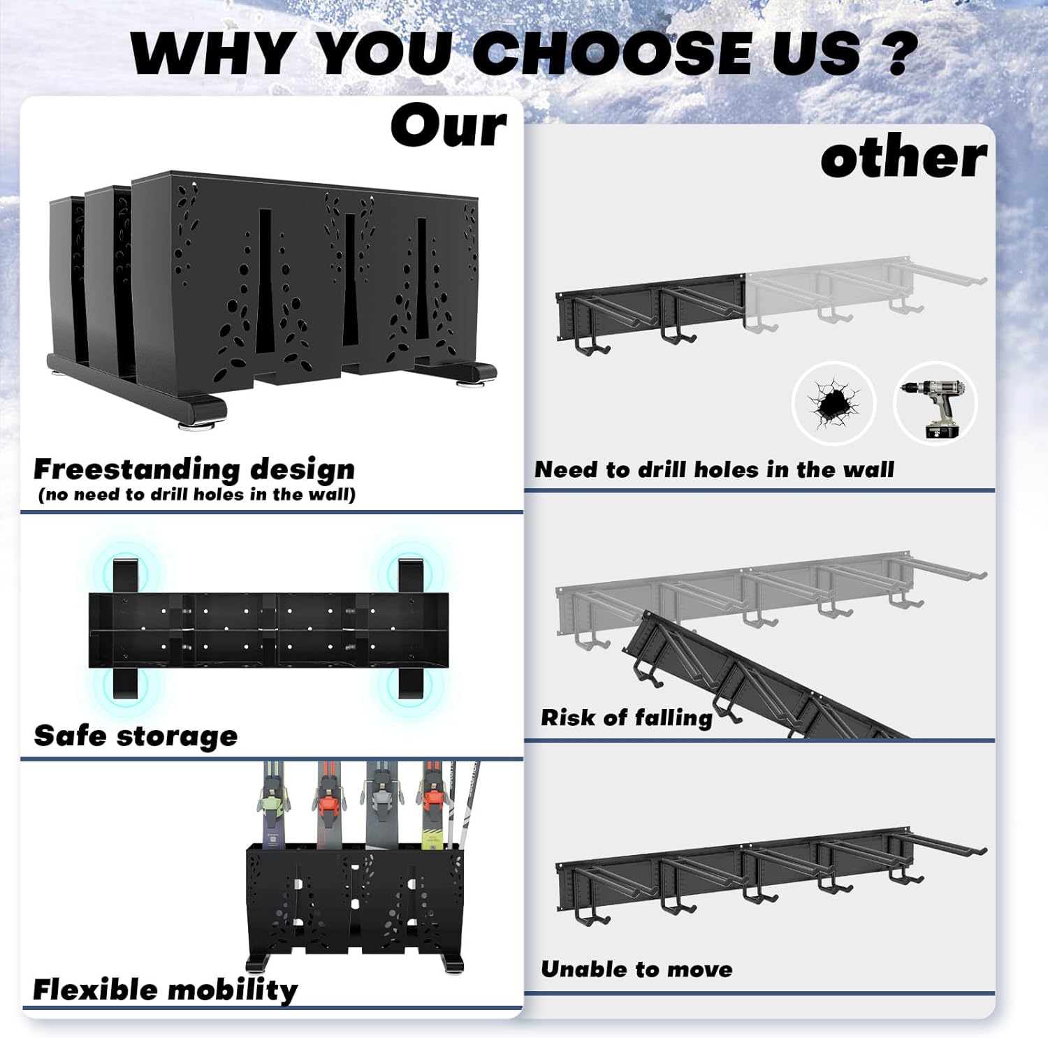 - Ideal for Snowboard and Ski Enthusiasts – Whether for your garage, home, or ski lodge, this versatile rack offers a convenient storage solution for ski and snowboard lovers, keeping your equipment safe and ready for the next adventure.
