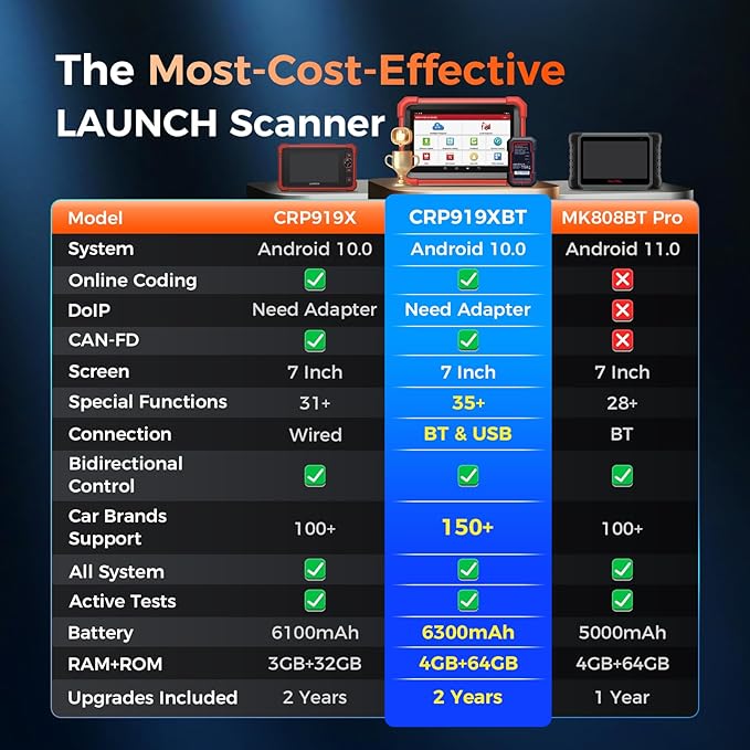 - [Why Choose CRP919X BT] Because this 2025 LAUNCH scanner leaves other scan tools in the dust. ✅ Beats MK808BT Pro / MK808S on features; less costs, more features. ✅ ECU coding matches luxury LAUNCH scanners X-431 PROS V+ 5.0 / PROS Elite. ✅ Extra functions you won’t find at this level: FCA AutoAuth, CAN-FD, DoIP, and built-in V.A.G step-by-step guides. ✅ Full wireless via Blu.t00th. ✅ Android 10.1, 4 GB RAM, 64 GB storage + 6,300 mAh battery = 14+ hours of nonstop smooth work.