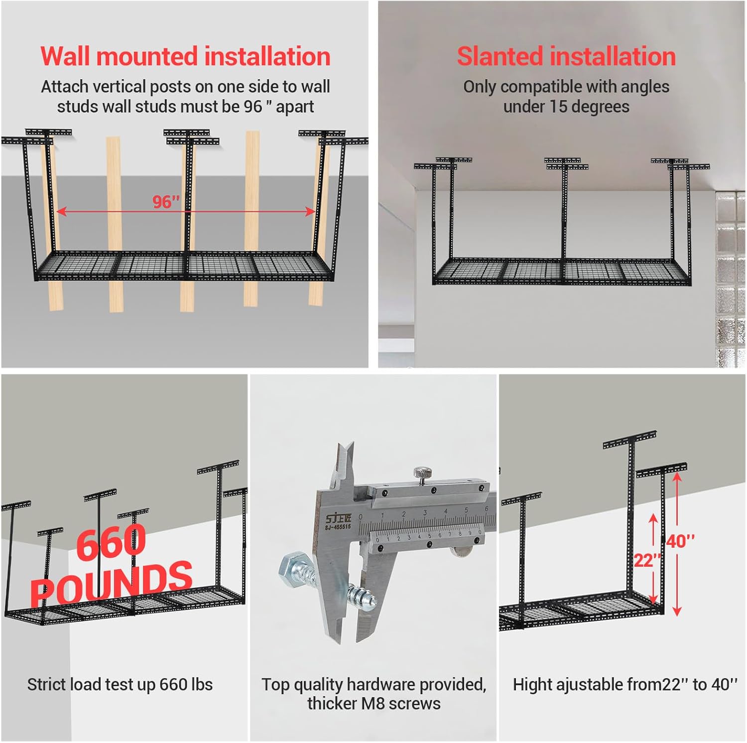 - 【VERSATILE OVERHEAD GARAGE STORAGE RACK】 Adapt to any garage setup with height adjustment from 22" to 40". This flexible feature fits various ceiling heights and storage needs, letting you optimize vertical space for items of different sizes—whether you’re storing small tools or large equipment.