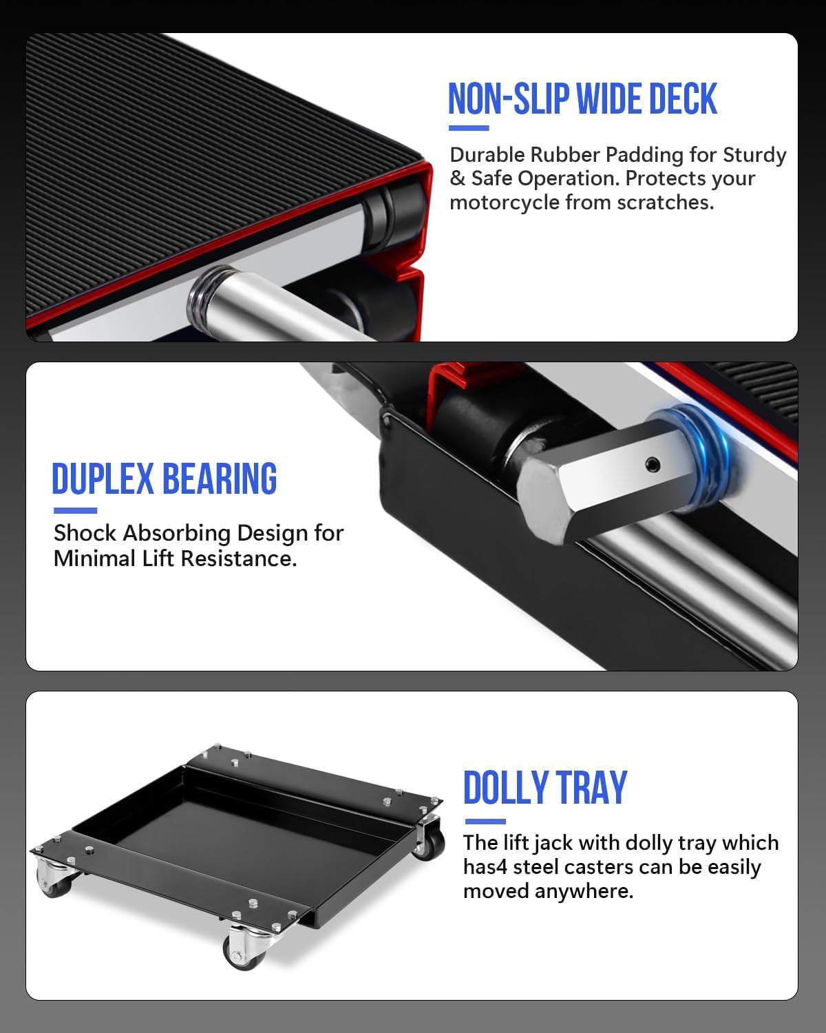 - Versatile Quick-Release Dolly System : Detach the dolly tray in seconds to convert between a rolling floor jack and ground-level scissor lift. The removable handle and lightweight steel construction make this motorcycle jack stand adaptable for various lifting needs, from basic maintenance to complex repairs using motorcycle stands and engine hoist applications.