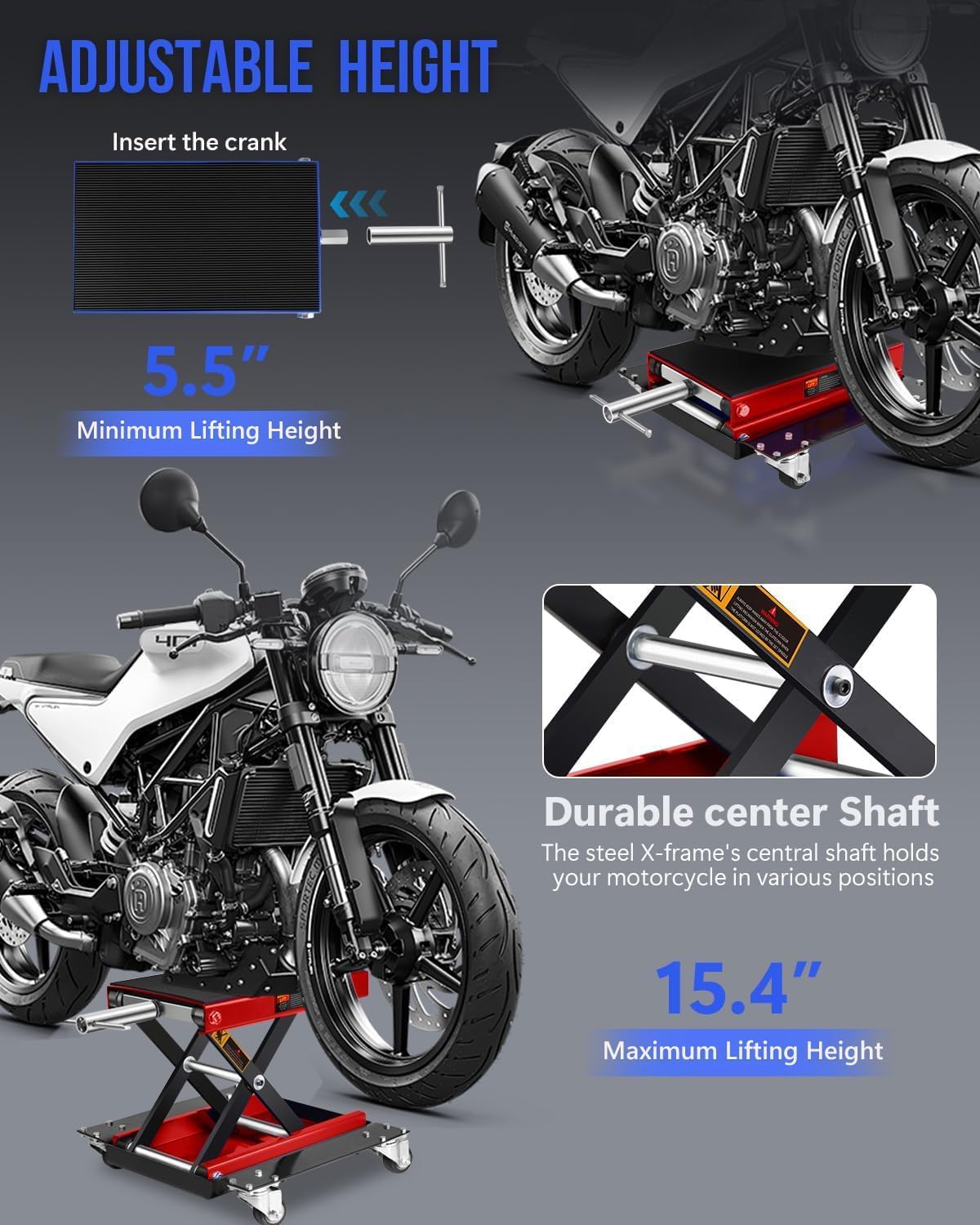 - Effortless Motorcycle Lift Operation :This heavy-duty motorcycle lift jack features simple hand-crank operation requiring no electricity or tools. The scissor jack design with central adjustable shaft and 360° swivel casters lets you easily lift and position bikes weighing up to 1100 lbs, making it ideal for various motorcycle accessories maintenance and repair tasks.