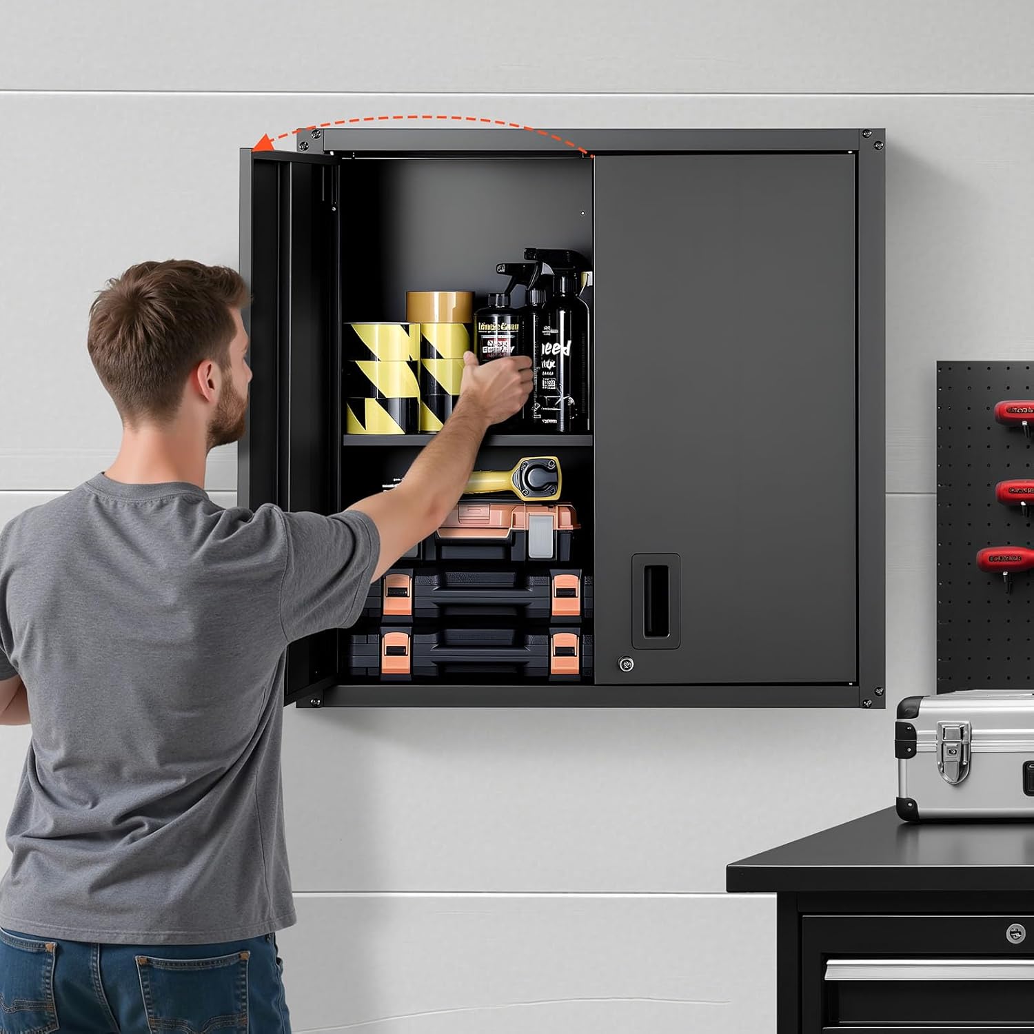 - Flexible Installation: The rail-mount design of the wall-mounted garage cabinet allows quick, secure, and flush wall installation. Ideal for garages, kitchens, or workshops—adjust placement to fit your layout