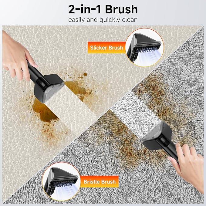 - 18KPa Turbo Suction: The carpet cleaner machine and upholstery cleaner machine is equipped with a powerful suction of 18,000Pa, it penetrates deep into the carpet fibers and fabrics, instantly absorb pet hair, long-standing stains, and residual spills. Whether it's the dirt in the sofa crevices or the deep-seated grime in the carpet, This carpet shampooer and furniture cleaner machine ensures your carpets and furniture stay spotless and fresh.