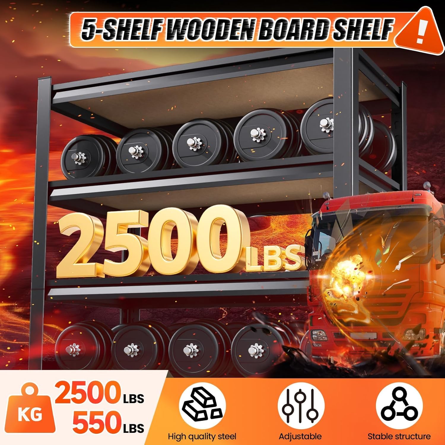 72" H*36'' Storage Shelves 2500lbs Garage Shelving, Adjustable Heavy Duty Garage Shelves, Easy to Install Metal Shelving Wood Shelving Unit, Storage Shelf for Basement Warehouse, 2 Pack