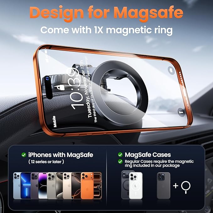 - "Broad Compatibility with MagSafe This 360 adjustable vacuum magnetic phone holder works with iPhone 17-12,combine with all MagSafe devices, Samsung Galaxy S/Note, A-series , other phones, and MagSafe/third-party magnetic cases. Whether your phone is used without a case or protected by one, you can attach it in merely a second using a single hand."