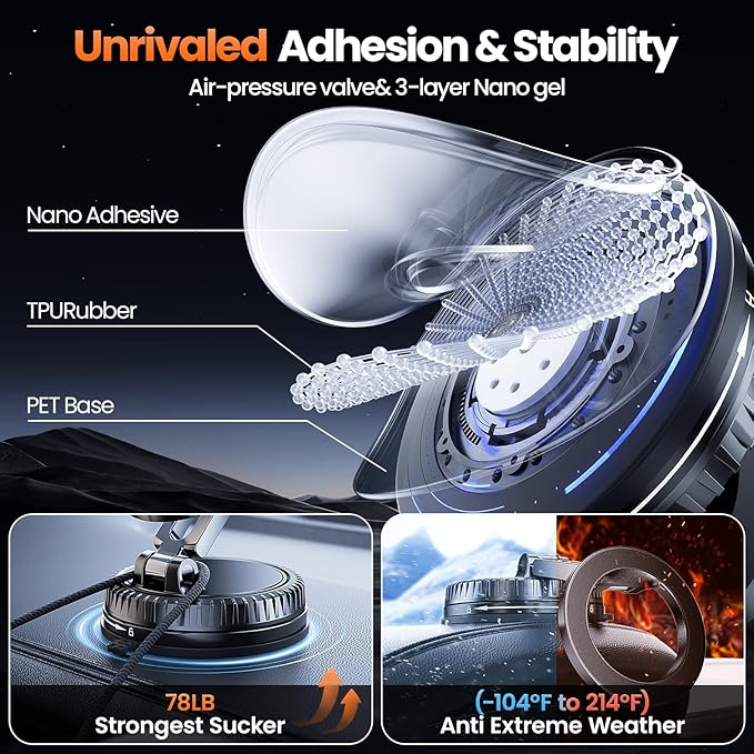 - Powerful Suction & Magnetic Grip This suction cup mount – high-performance vacuum magnetic holder – uses advanced twist-lock vacuum tech (50% stronger vs. conventional press types) and strong magnet for secure hold. Its 4-layer nano-gel cup bears 96lbs, stays attached in -40°F to 300°F, while magnet fits most ≤3mm cases (no credit cards). Passed 9,999+ tests, it ensures steady commutes and long trips.