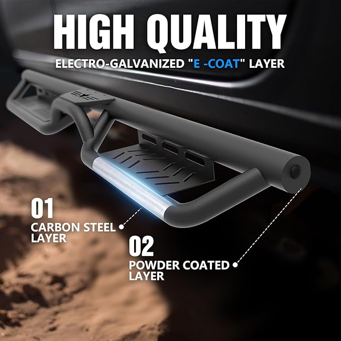 - 【Functional Design】:① The side steps feature a dual - layer layout, offering greater convenience for vehicles equipped with lift kits and oversized tires. It also facilitates easy access to the vehicle's roof.② The 6 - inch drop - down step pads provide excellent accessibility for pickup trucks with lift kits and oversized tires, while maintaining sufficient ground clearance.