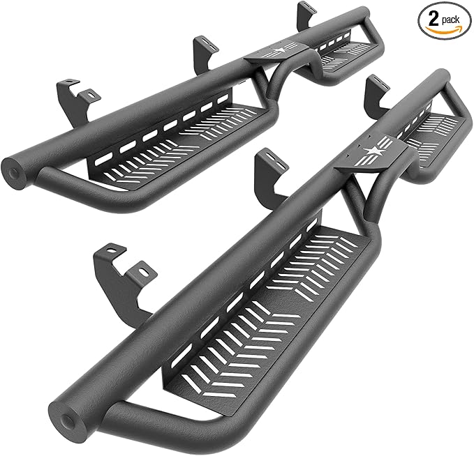 - 【Functional Design】:① The side steps feature a dual - layer layout, offering greater convenience for vehicles equipped with lift kits and oversized tires. It also facilitates easy access to the vehicle's roof.② The 6 - inch drop - down step pads provide excellent accessibility for pickup trucks with lift kits and oversized tires, while maintaining sufficient ground clearance.