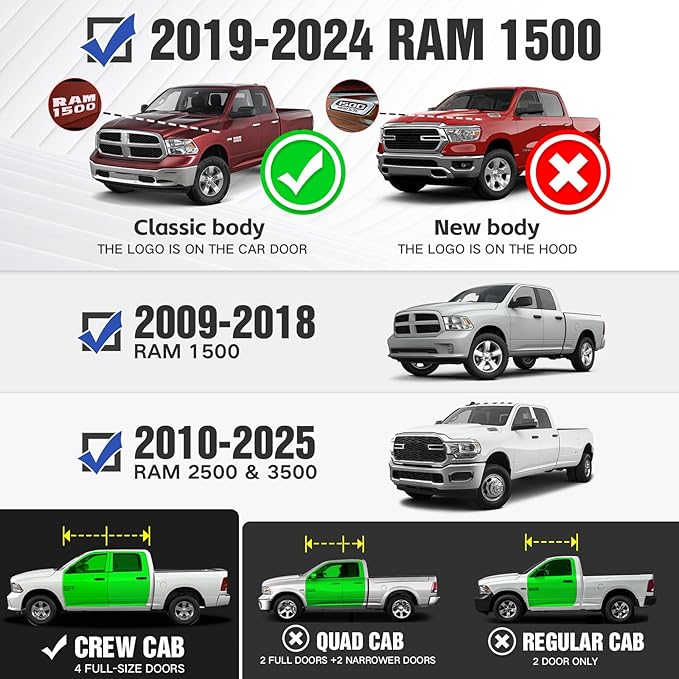 - 【Compatibility】: Three Raised Steps Running Boards are compatible with 2009-2018 Dodge Ram 1500 Crew Cab, 2019-2024 Ram 1500 Classic, 2010-2024 Ram 2500 & 3500 Crew Cab (4 Full-Size Doors). If you are not sure about your model, please check the cab dimensions picture.