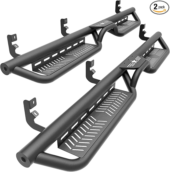 - 【Functional Design】:① The side steps feature a dual - layer layout, offering greater convenience for vehicles equipped with lift kits and oversized tires. It also facilitates easy access to the vehicle's roof.② The 6 - inch drop - down step pads provide excellent accessibility for pickup trucks with lift kits and oversized tires, while maintaining sufficient ground clearance.
