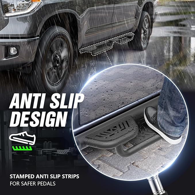 - 【Compatibility】: Three Raised Steps Running Boards are compatible with 2007 2008 2009 2010 2011 2012 2013 2014 2015 2016 2017 2018 2019 2020 2021 Toyota Tundra Crew Cab (4 Full-Size Doors). If you are not sure about your model, please check the cab dimensions picture.