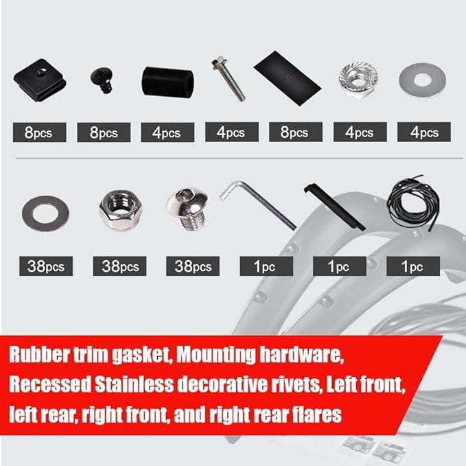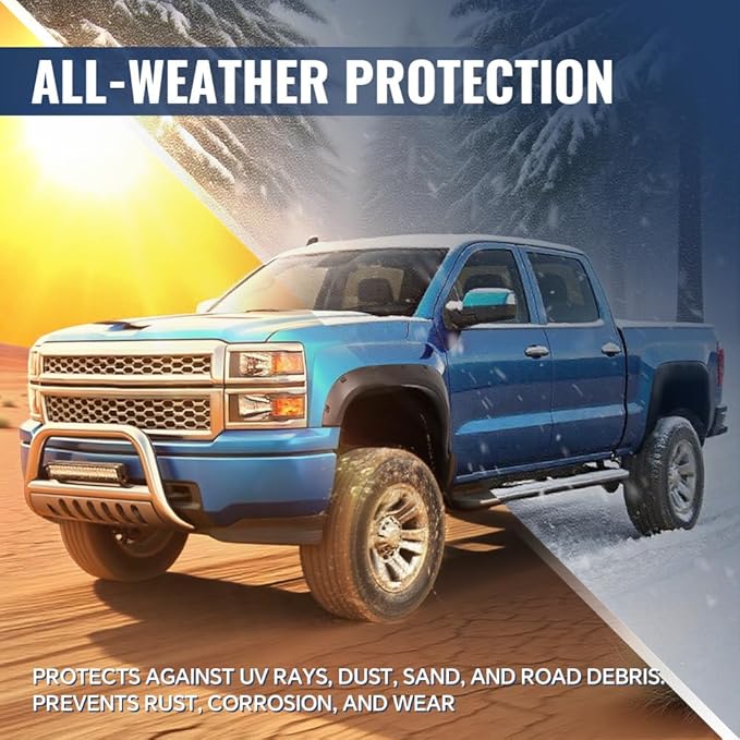 - Installation Instructions: Includes necessary installation kit. May not fit if other accessories are installed which may get in the way of the Fender Flares (i.e. mudflaps, body molding, ground effects, etc.)