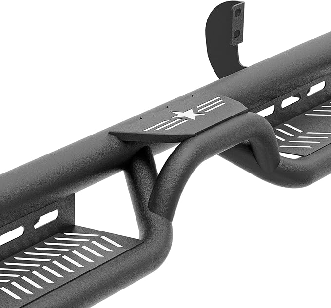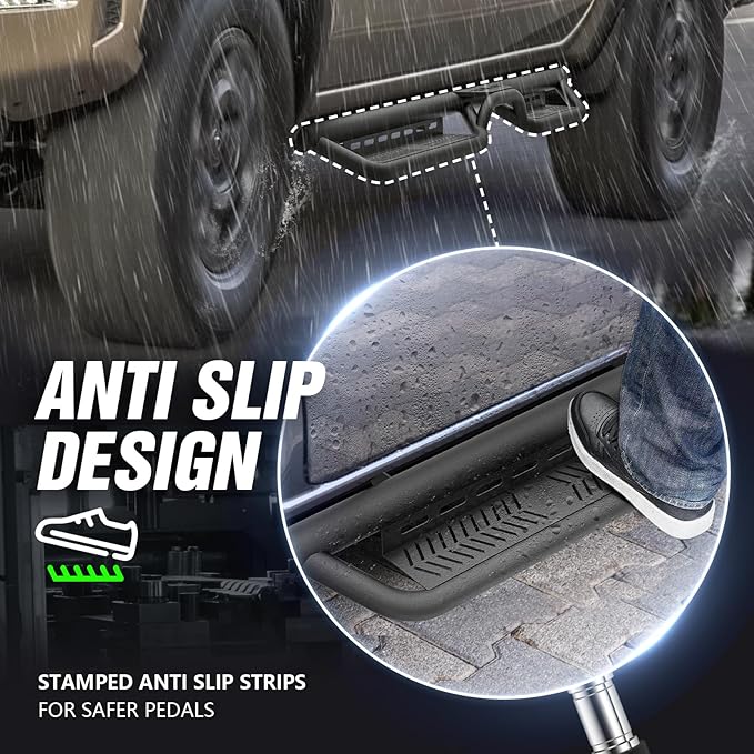 - 【Functional Design】:① The side steps feature a dual - layer layout, offering greater convenience for vehicles equipped with lift kits and oversized tires. It also facilitates easy access to the vehicle's roof.② The 6 - inch drop - down step pads provide excellent accessibility for pickup trucks with lift kits and oversized tires, while maintaining sufficient ground clearance.