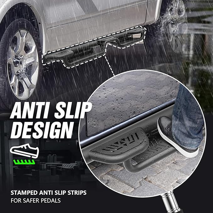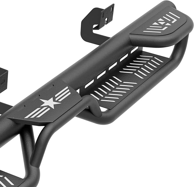 - 【Robust and Durable】: The high-quality black powder coating provides outstanding rust and corrosion resistance. Constructed from heavy-duty 2mm carbon steel, each side can withstand a weight of 550 pounds. Precision laser cutting and stamping techniques contribute to a non-slip step surface and enhanced traction.