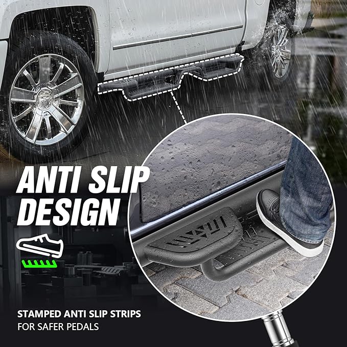 - 【Compatibility】: Three Raised Steps Running Boards are compatible with 2007-2018 Chevy Silverado & GMC Sierra 1500, 2007-2019 Chevrolet Silverado & GMC Sierra 2500HD 3500HD Crew Cab (4 Full-Size Doors). If you are not sure about your model, please check the cab dimensions picture.