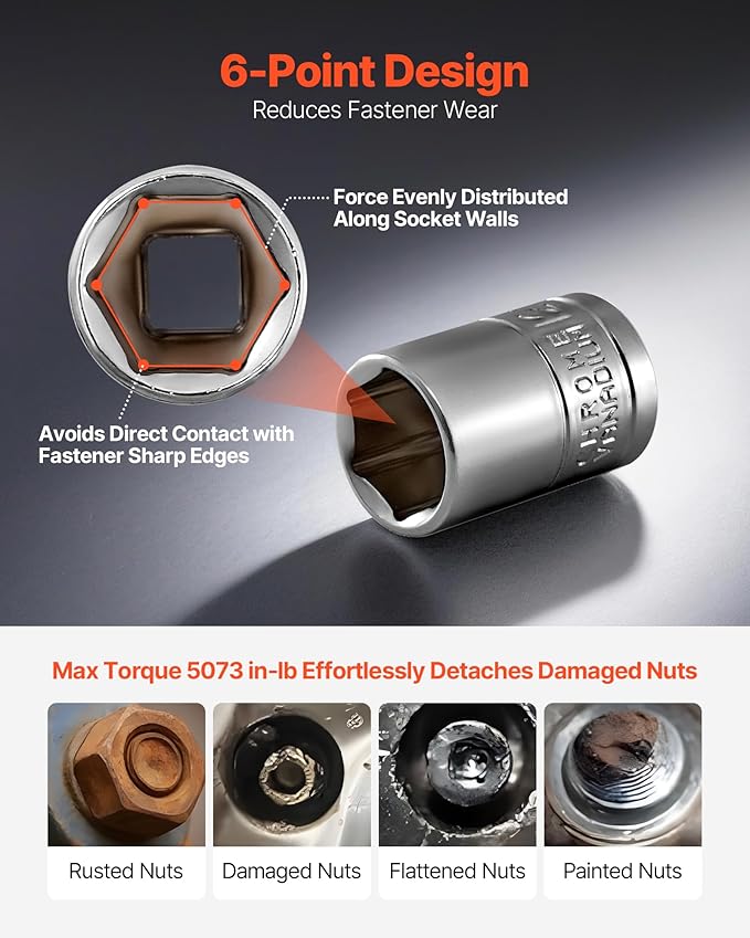 - High Torque Design: Designed with a 6-point configuration, this 3/8 & 1/4 & 1/2 in socket set evenly distributes pressure on fasteners to minimize wear. Its high-torque capability delivers up to 5073 IN-LB, easily handling rusted or tightly secured bolts