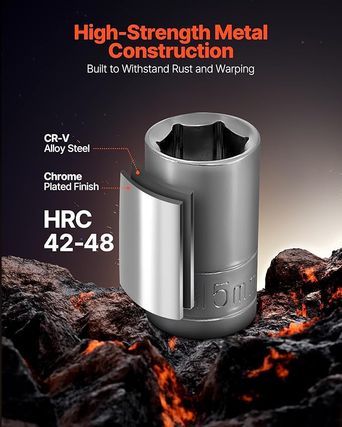 - Built to Last: Forged from high-strength CR-V alloy steel and heat-treated to HRC42-48, this socket set provides superior impact resistance and long-lasting durability. The chrome-plated finish withstands rust and ensures long-lasting use