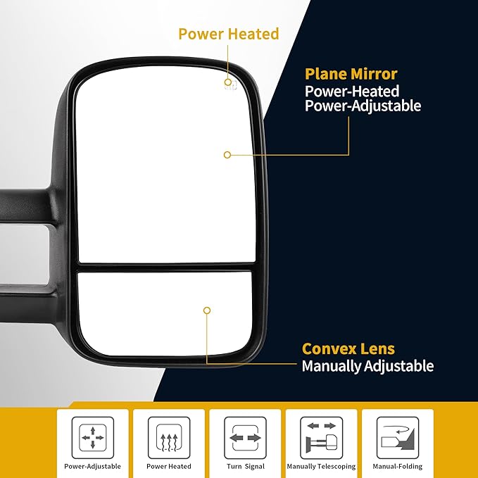 - 3. Dual-Glass Telescoping & Fold Design: Features a power-adjusted flat mirror paired with a manual convex mirror for adjustable views; the telescoping system extends for wider trailer coverage and folds compactly for easy storage and parking