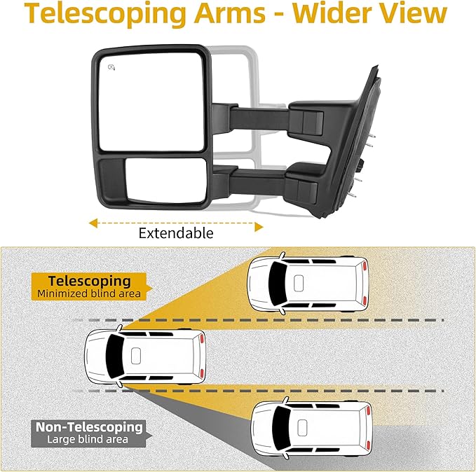 - Advanced Functionality: Boasts power adjustable and heated main mirror, manually adjustable convex lens, dual-arm extendable design, and integrated smoke signal lights. This set enhances safety, convenience, and driving experience for 99-07 Ford Super Duty owners