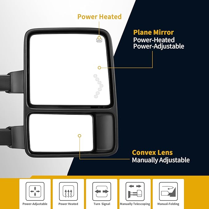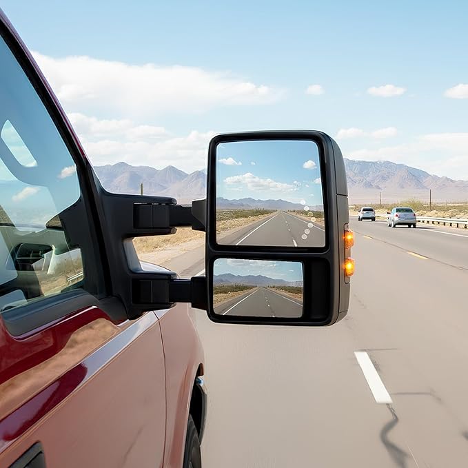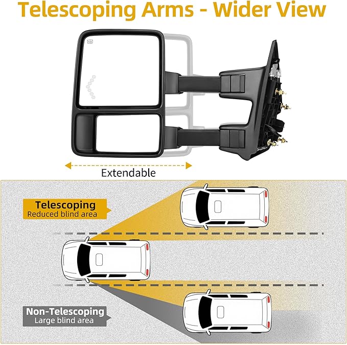 - 3.All-Weather Reliability: Power-heated mirrors prevent fogging and freezing, while manual telescoping extends to 19.25" for optimal trailer coverage, ideal for rain, snow, or low-light driving