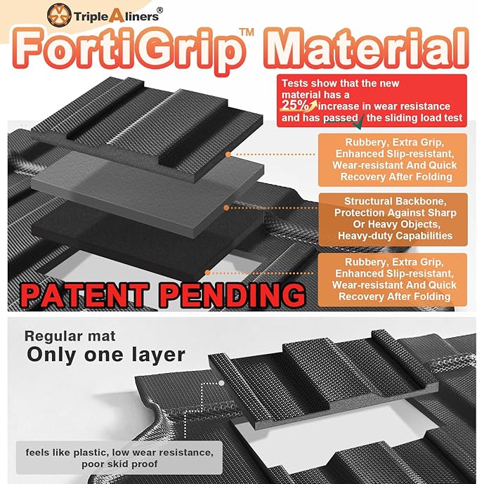 - FortiGrip Material: Our truck bed tailgate mat is crafted with TripleAliners Patent Pending FortiGrip Material, which has a 25% increase in wear resistance and it is tested and proved that it could better prevent the tailgate from damage compared with regular material in the same production way.