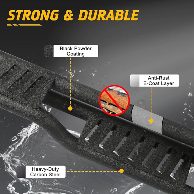 - Durability: The drop down running boards are constructed with heavy duty carbon steel and black powder coating that resists rust and corrosion. Allow 550 lbs loading capacity for each step pad